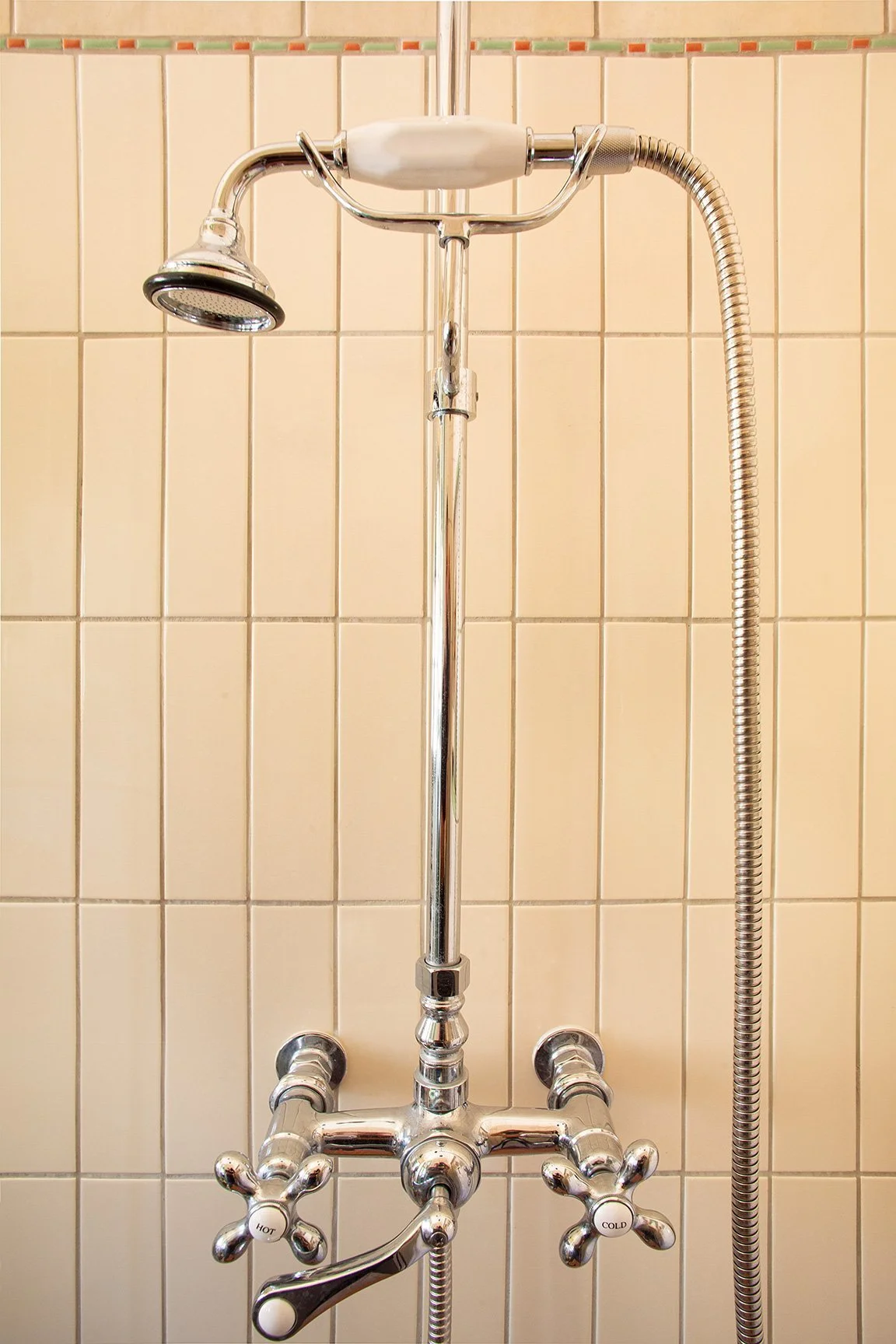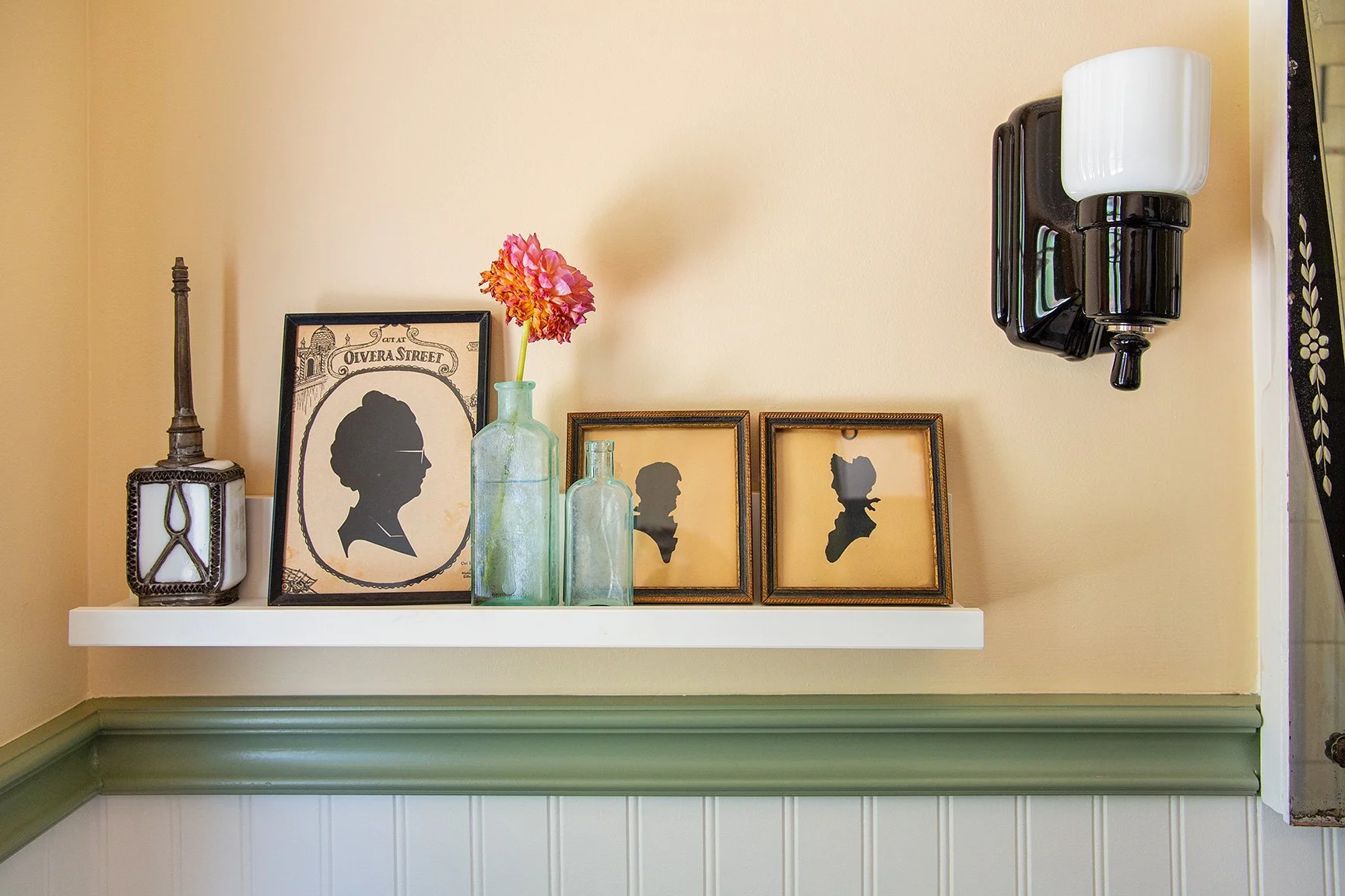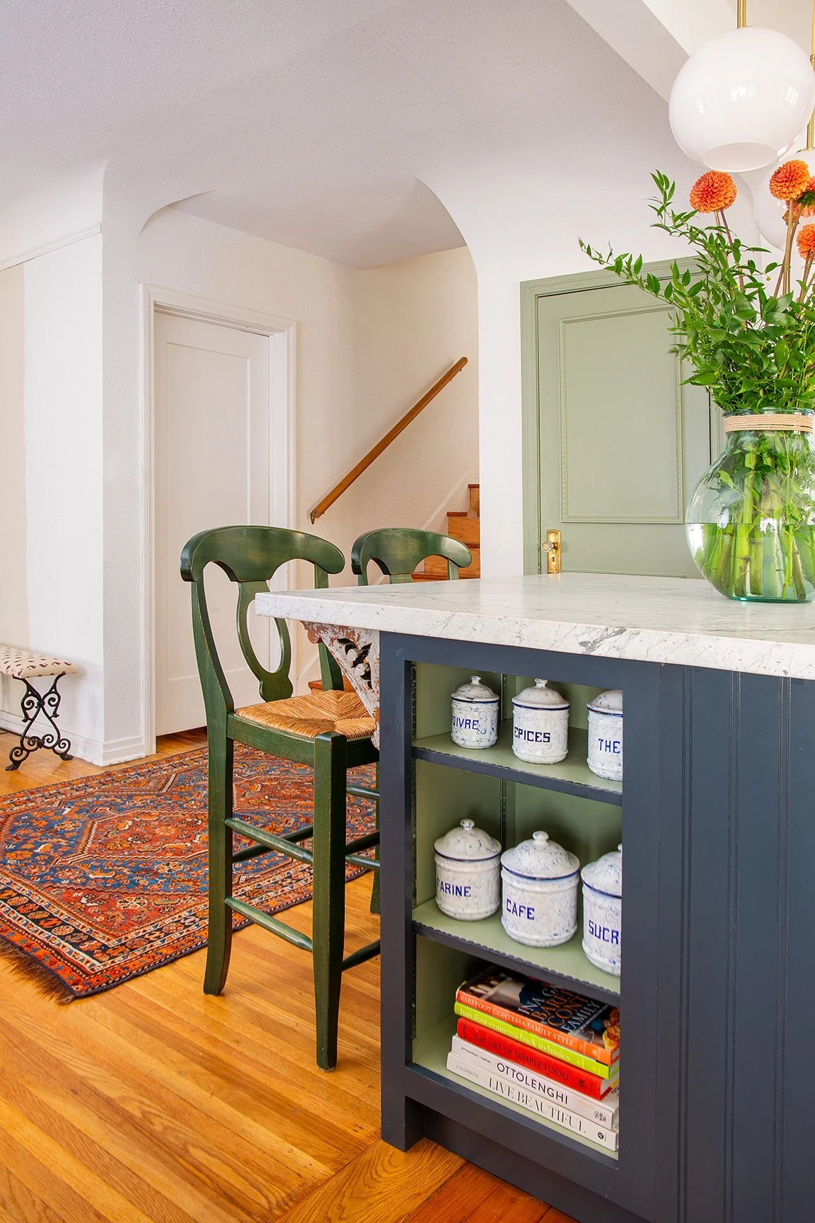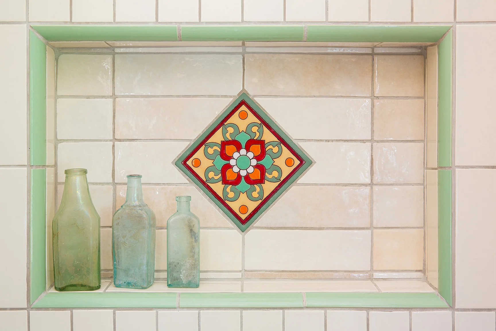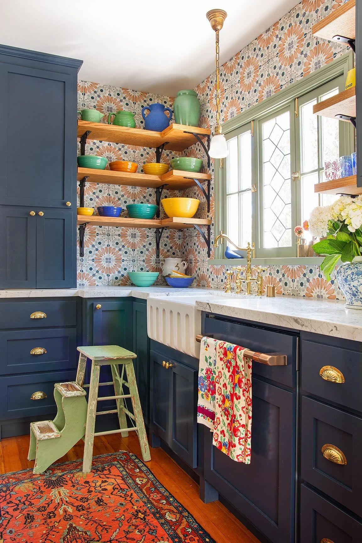 Real linoleum tile flooring was added in the laundry and bathroom. A full custom kitchen utilized brightly patterned backsplash tile all the way to the ceiling, and custom cabinets in a charcoal blue. The dated window over the sink was restored with a vintage leaded glass window, and a combination of vintage and contemporary lighting brings the whole space together. A tiny bathroom was remodeled to maximize the space with a walk-in shower, brightly tiled, and a clever shelf vanity that holds a vessel sink.