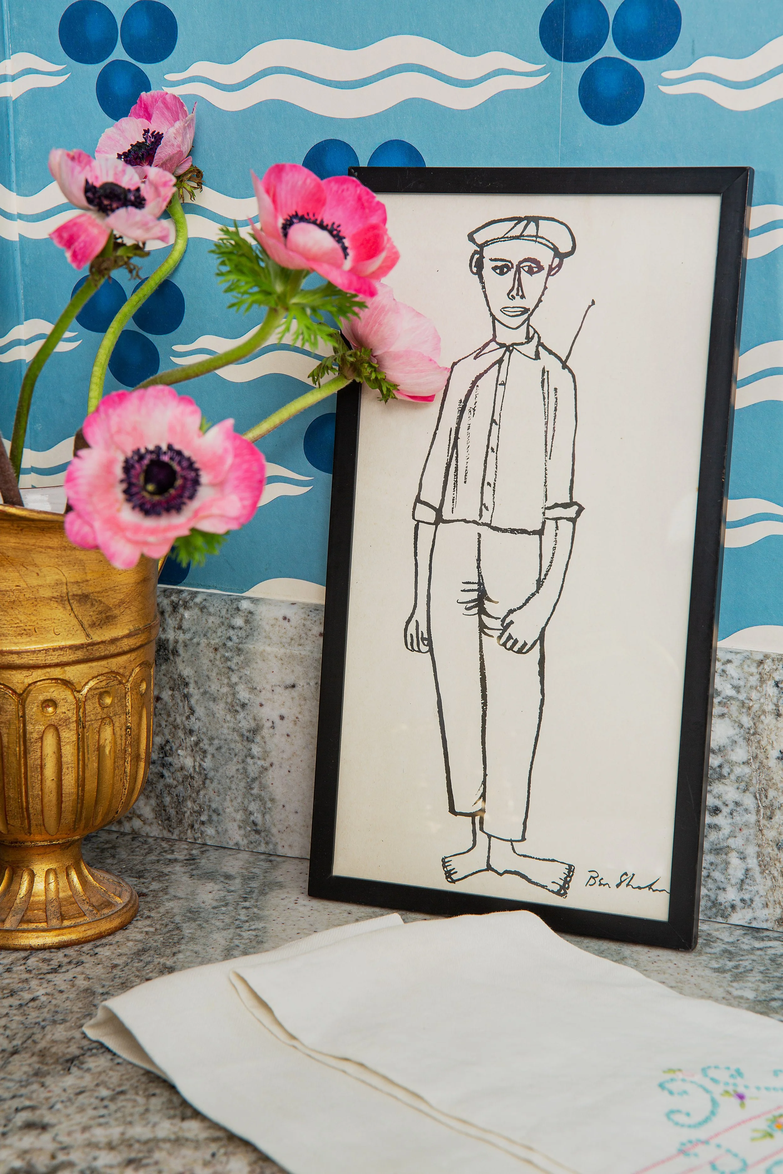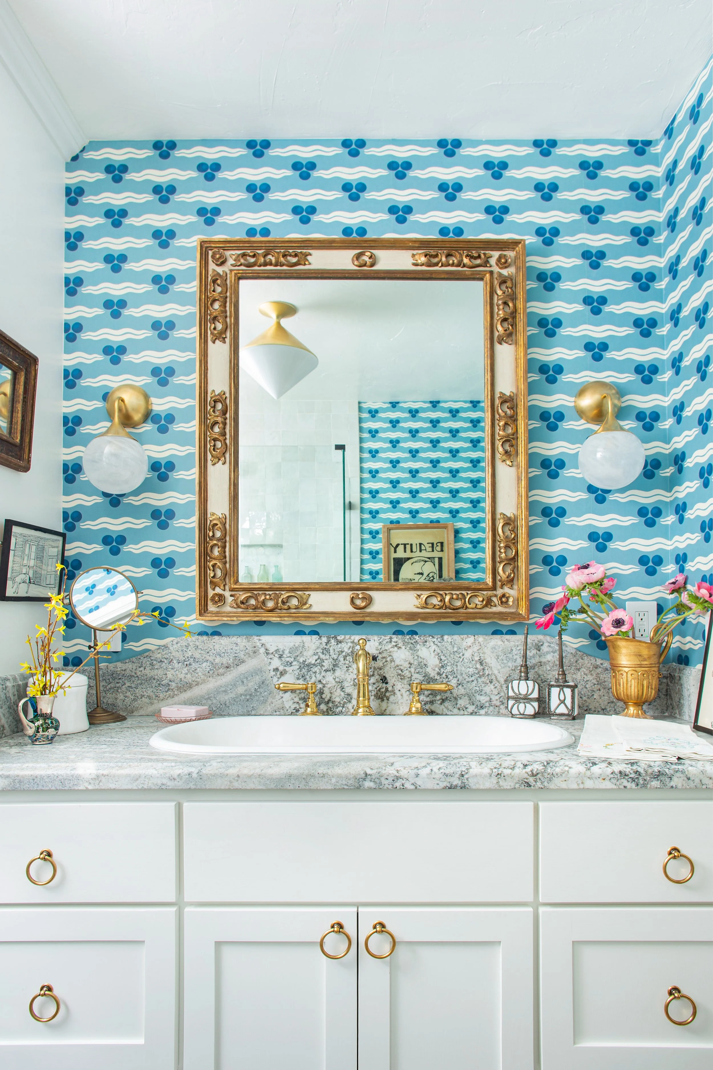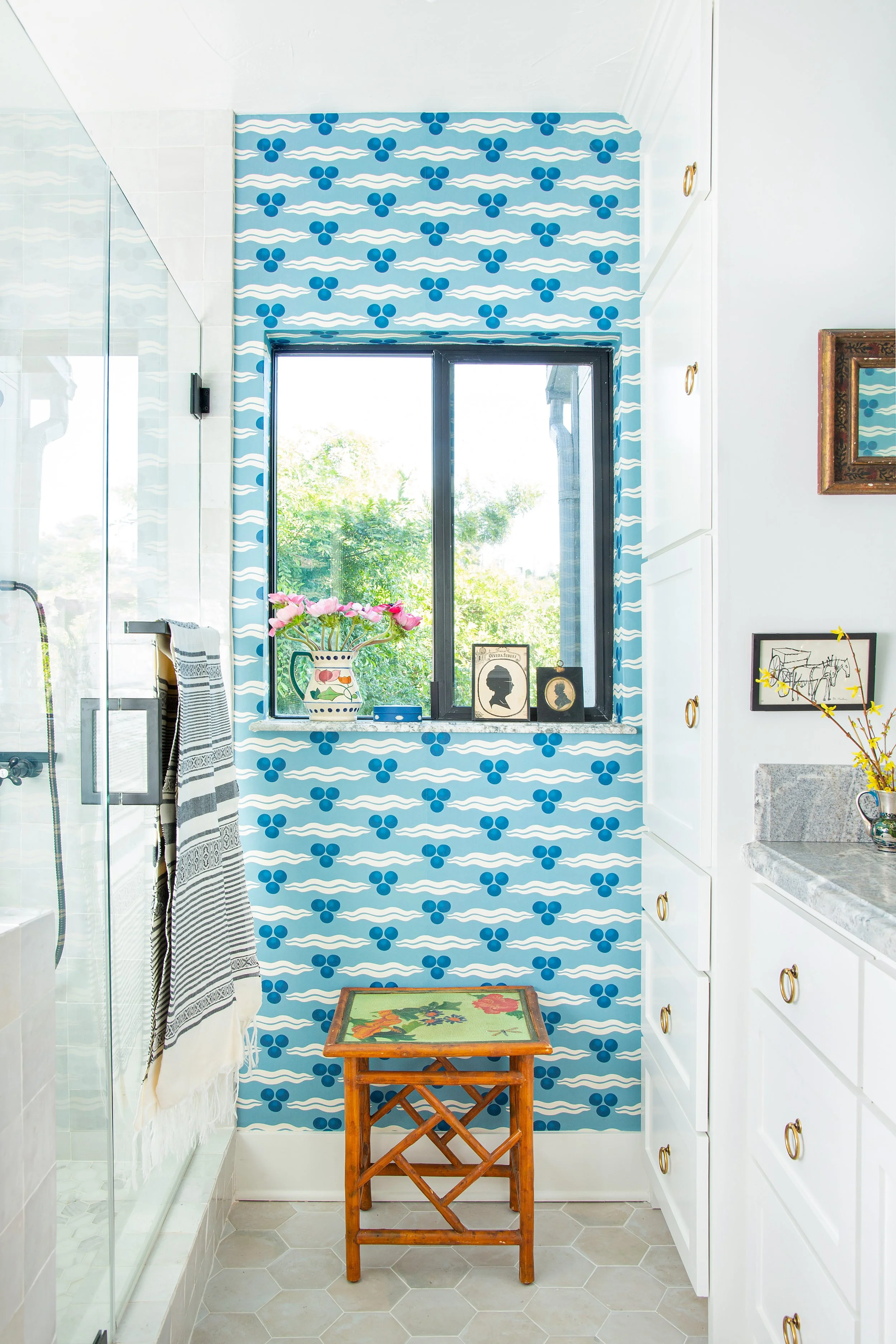 We also remodeled the Hall Bathroom on this floor, getting rid of an awkward soffit, and replacing the dated tub with a walk-in zellige tiled shower. Brightly patterned wallpaper in blue makes the walls pop! Decor in the Living Room and a “new” vintage Front Door makes the space look like it should have the day it was built!