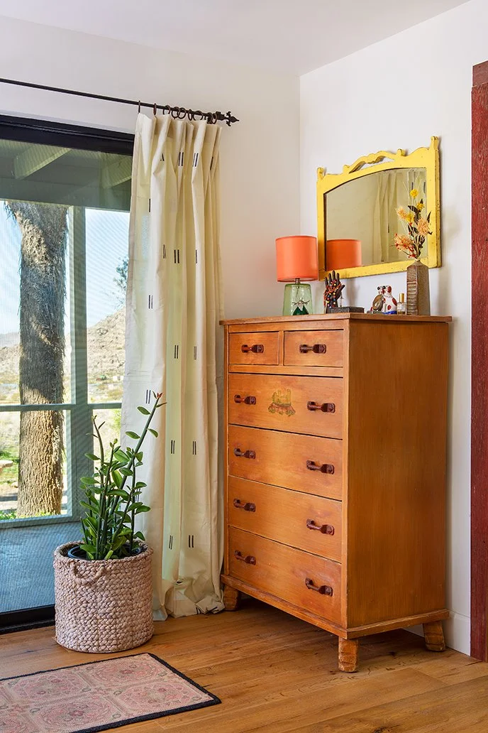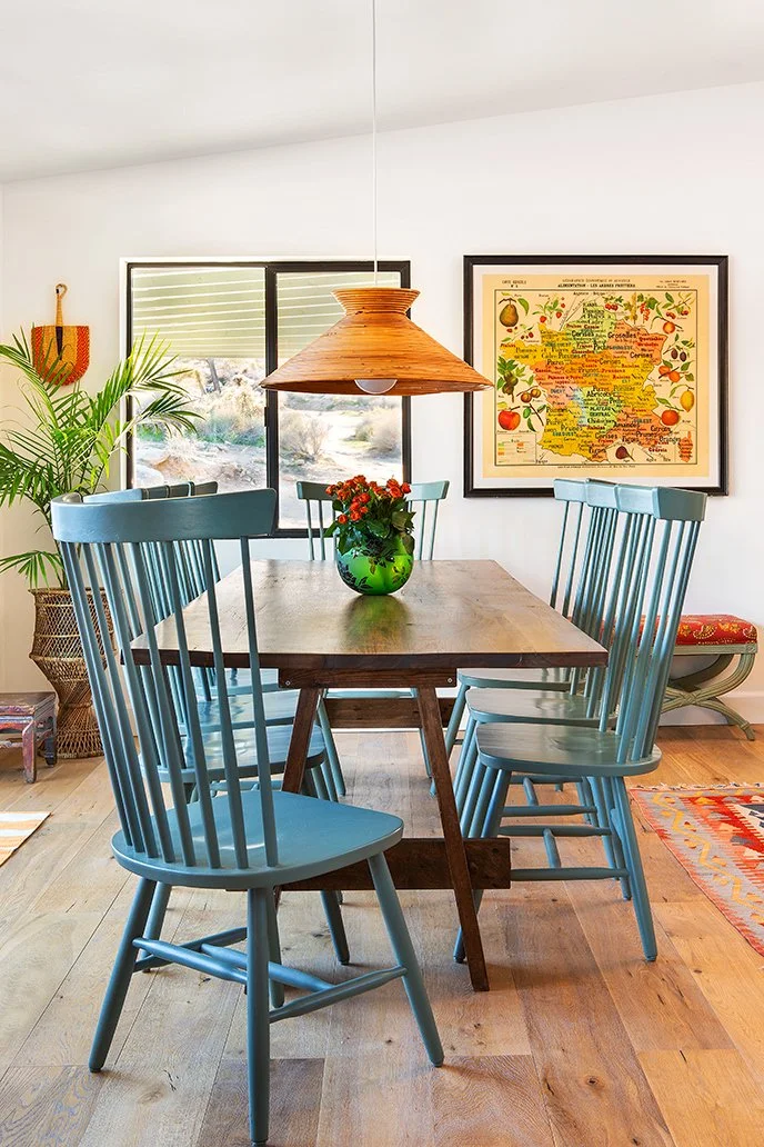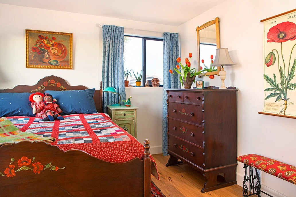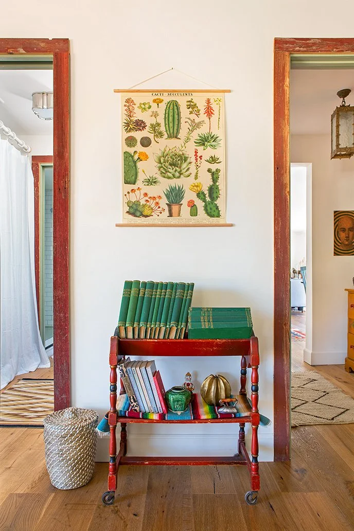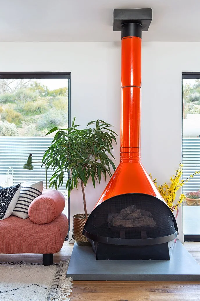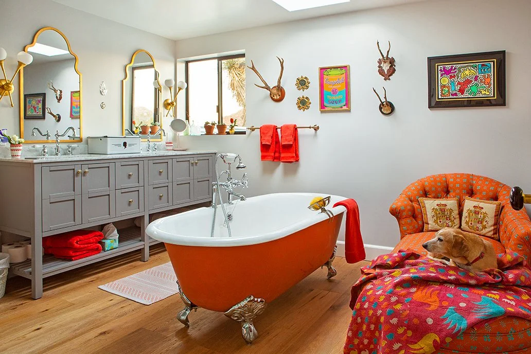 The decor was completed with an open kitchen with a vintage O’keefe and Merritt stove and IKEA cabinets. The new bathroom features an orange free standing claw foot tub and a large walk-in shower with Moroccan style encaustic tile. The house was sold in 2025 after a long run as a five star Airbnb property.