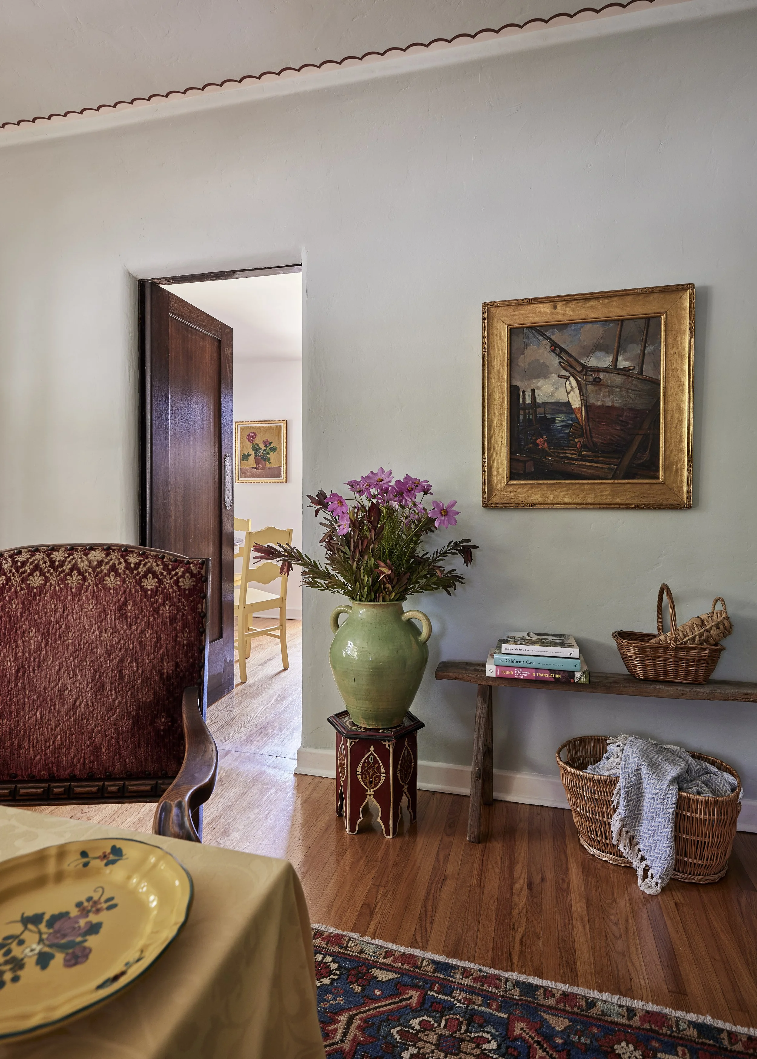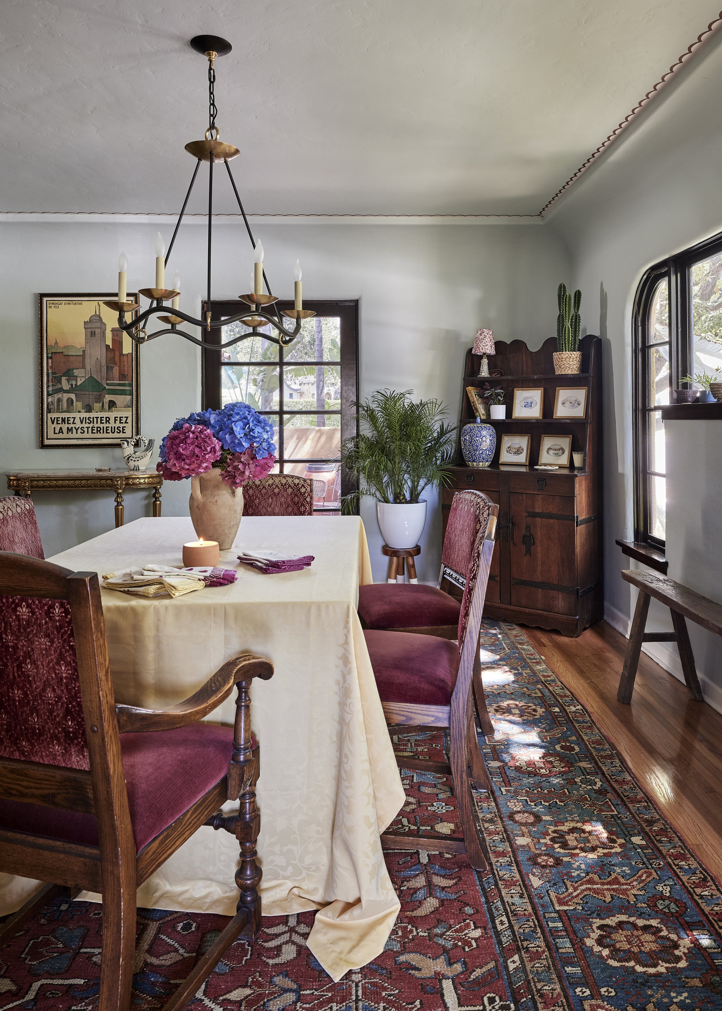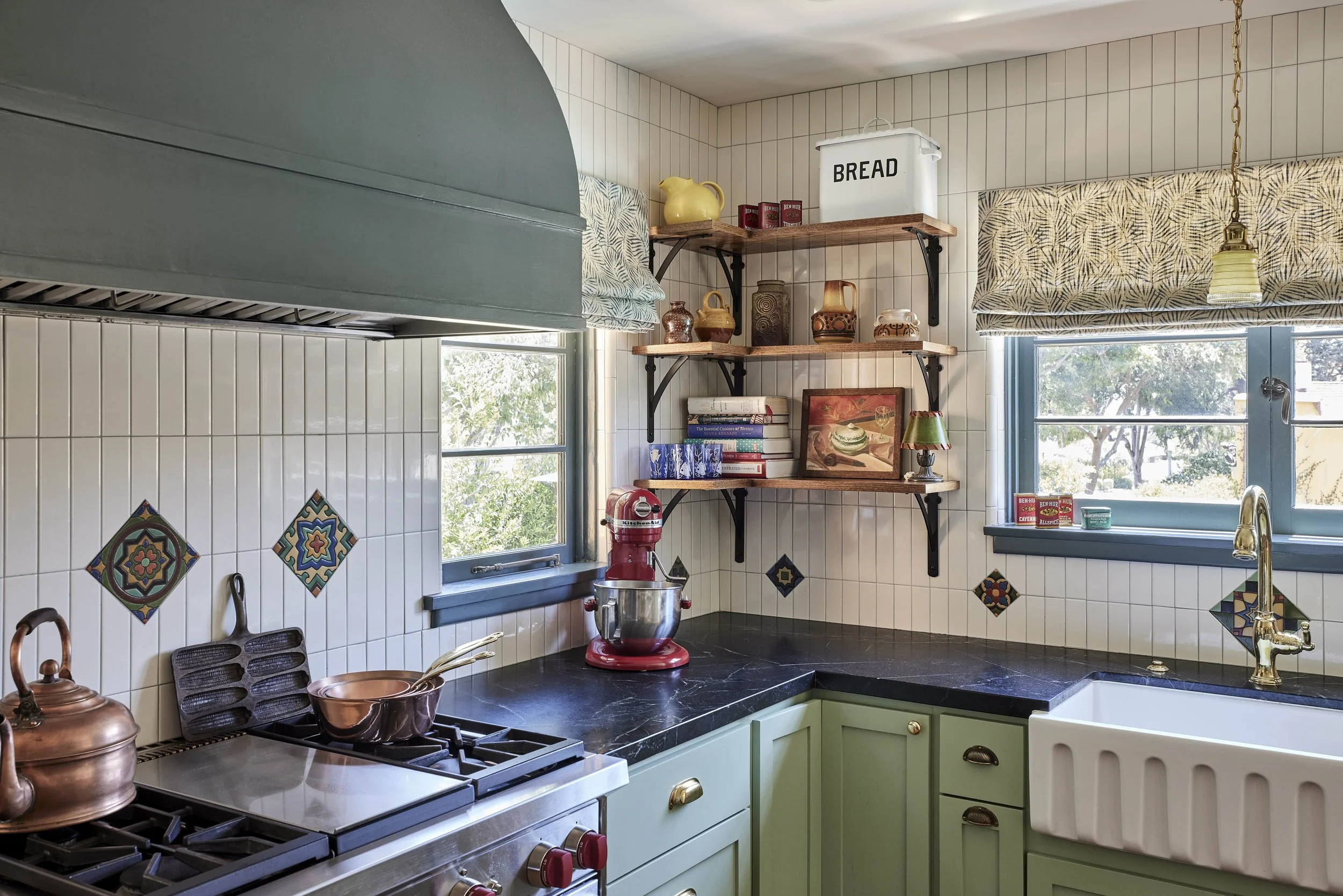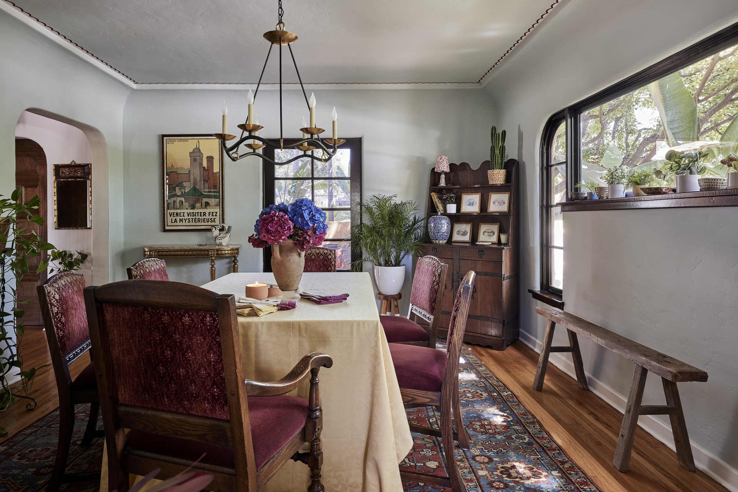 We replaced the flooring with brand new oak to match the rest of the house, and also repainted and decorated the dining room. The style speaks to the owner’s love of vintage, old California/Spanish style, bright colors and patterned tile. All new Wolf and Sub-Zero appliances shine in a space that preserves the original wood windows and doors. Custom cabinetry includes the 8’ island with French Country carved legs. Counters are soapstone and Venetino marble.