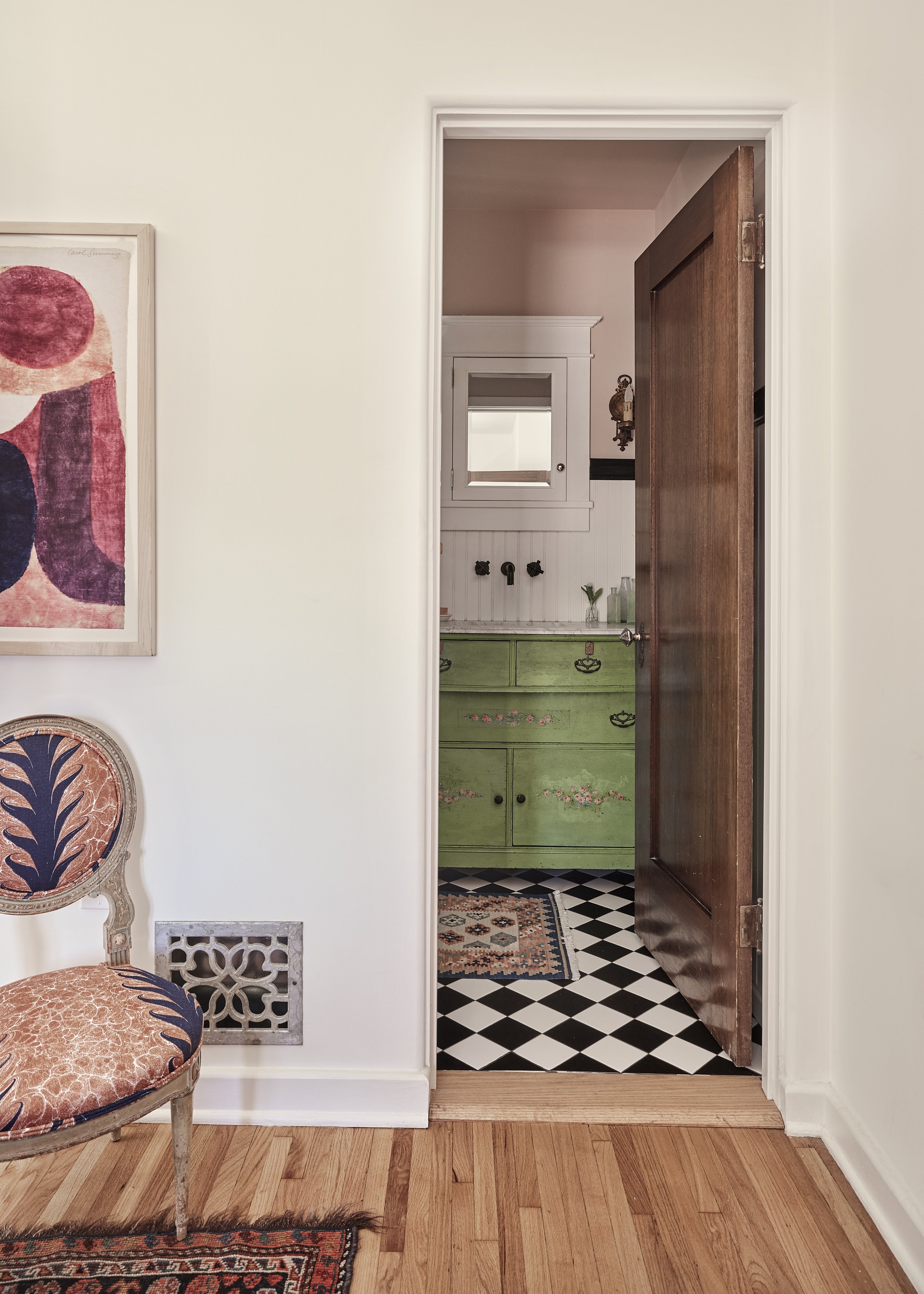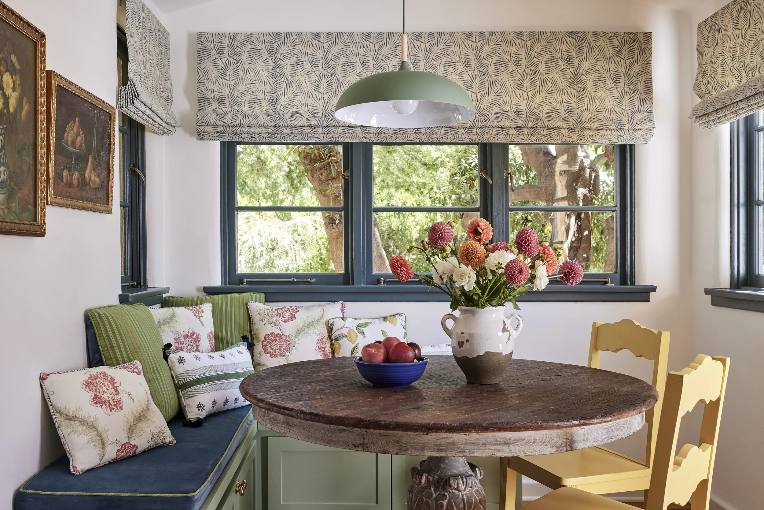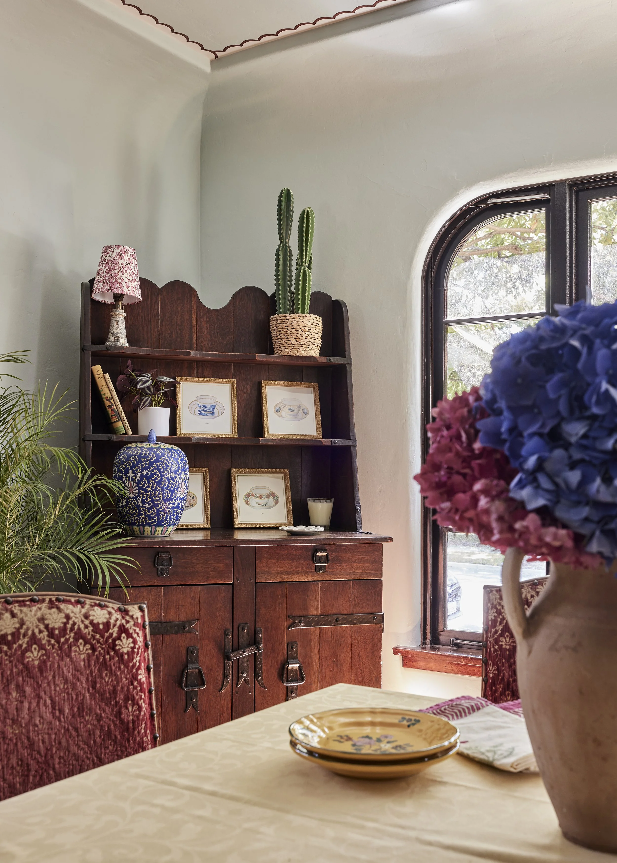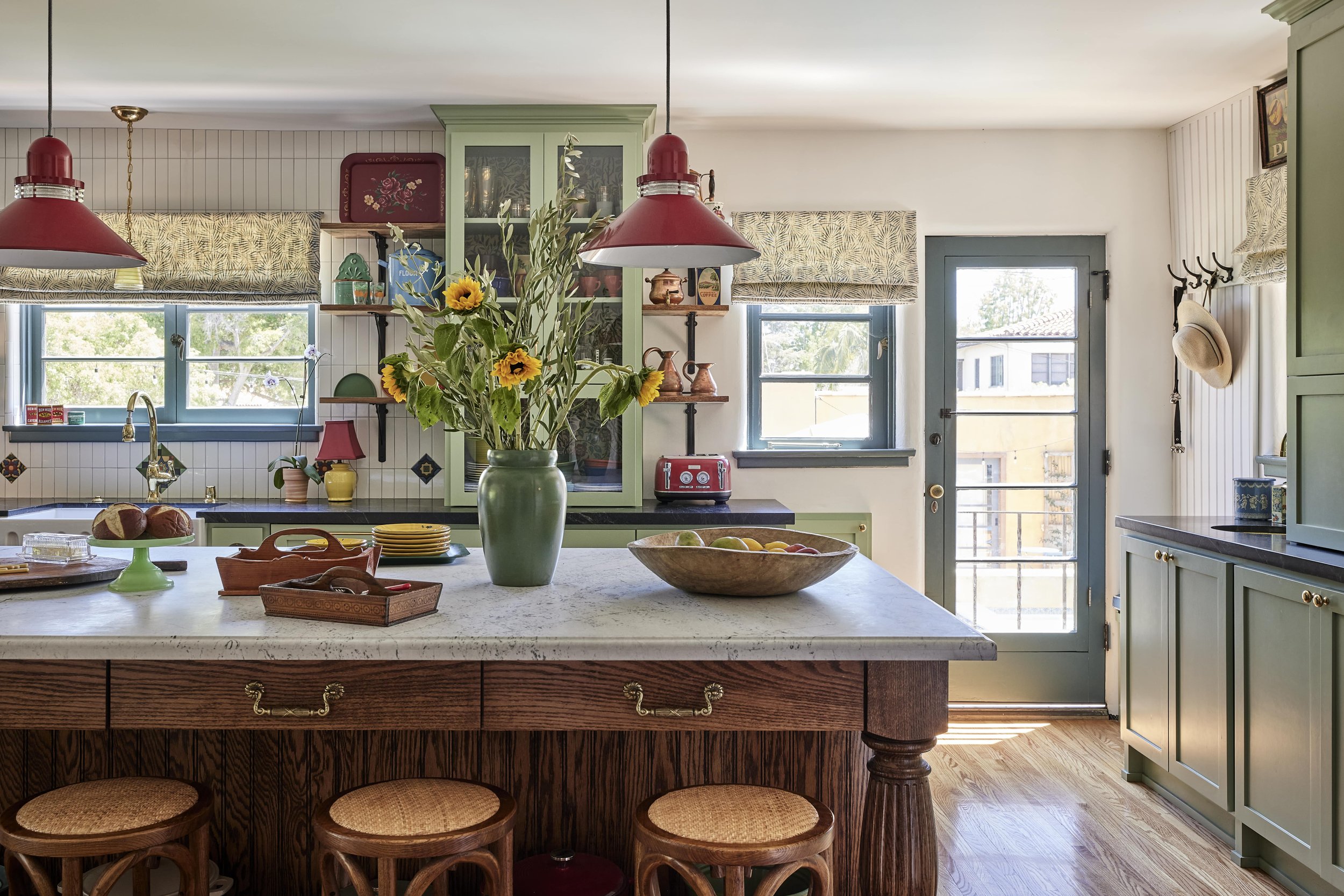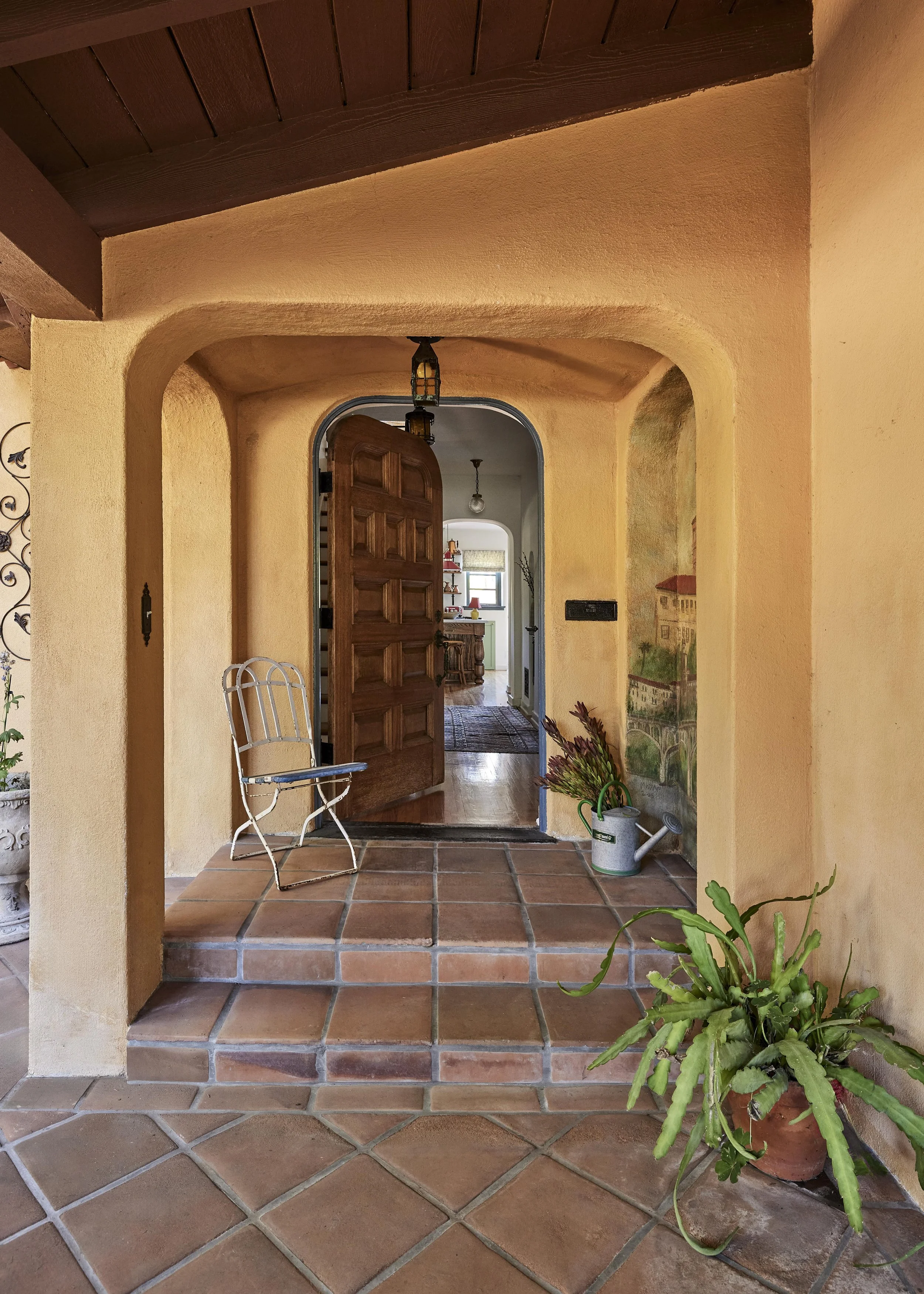 We replaced the flooring with brand new oak to match the rest of the house, and also repainted and decorated the dining room. The style speaks to the owner’s love of vintage, old California/Spanish style, bright colors and patterned tile. All new Wolf and Sub-Zero appliances shine in a space that preserves the original wood windows and doors. Custom cabinetry includes the 8’ island with French Country carved legs. Counters are soapstone and Venetino marble.