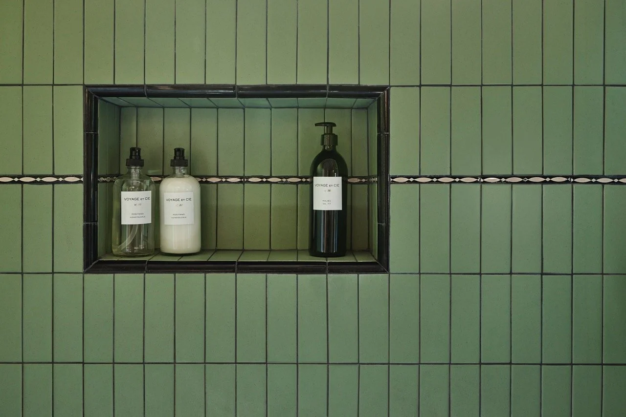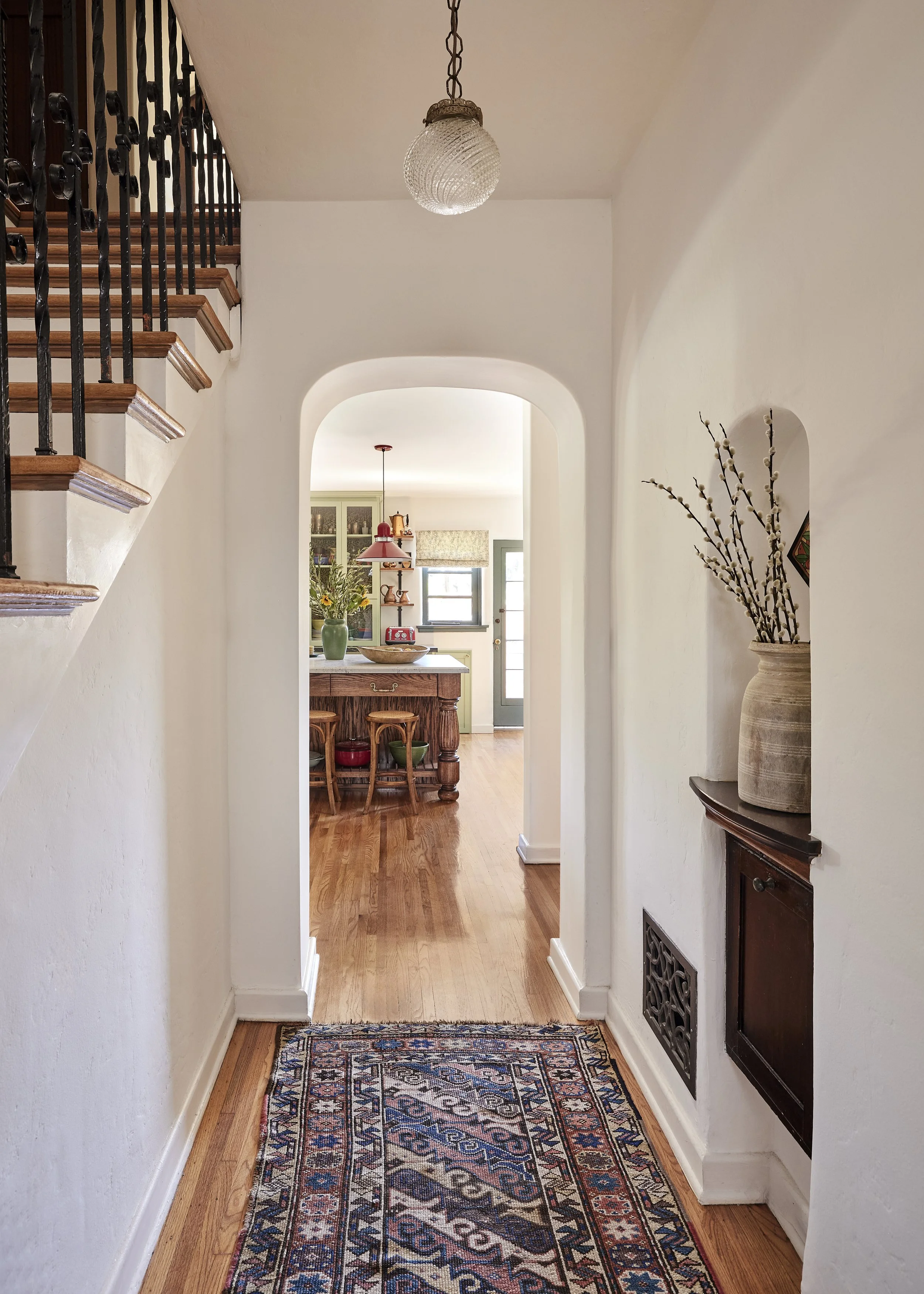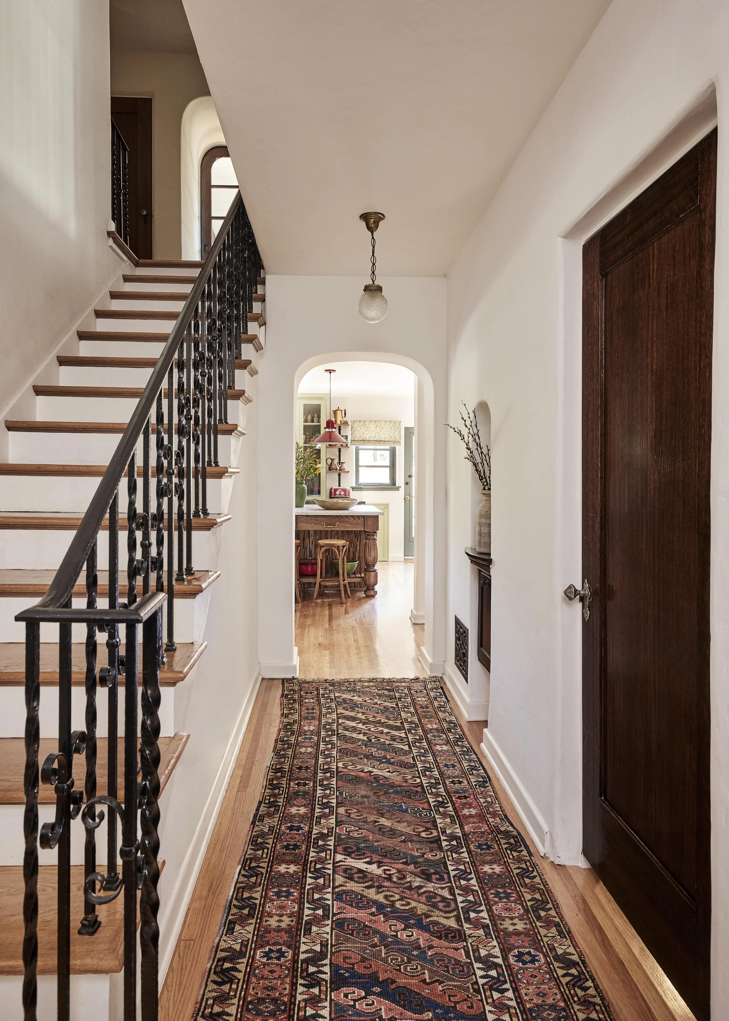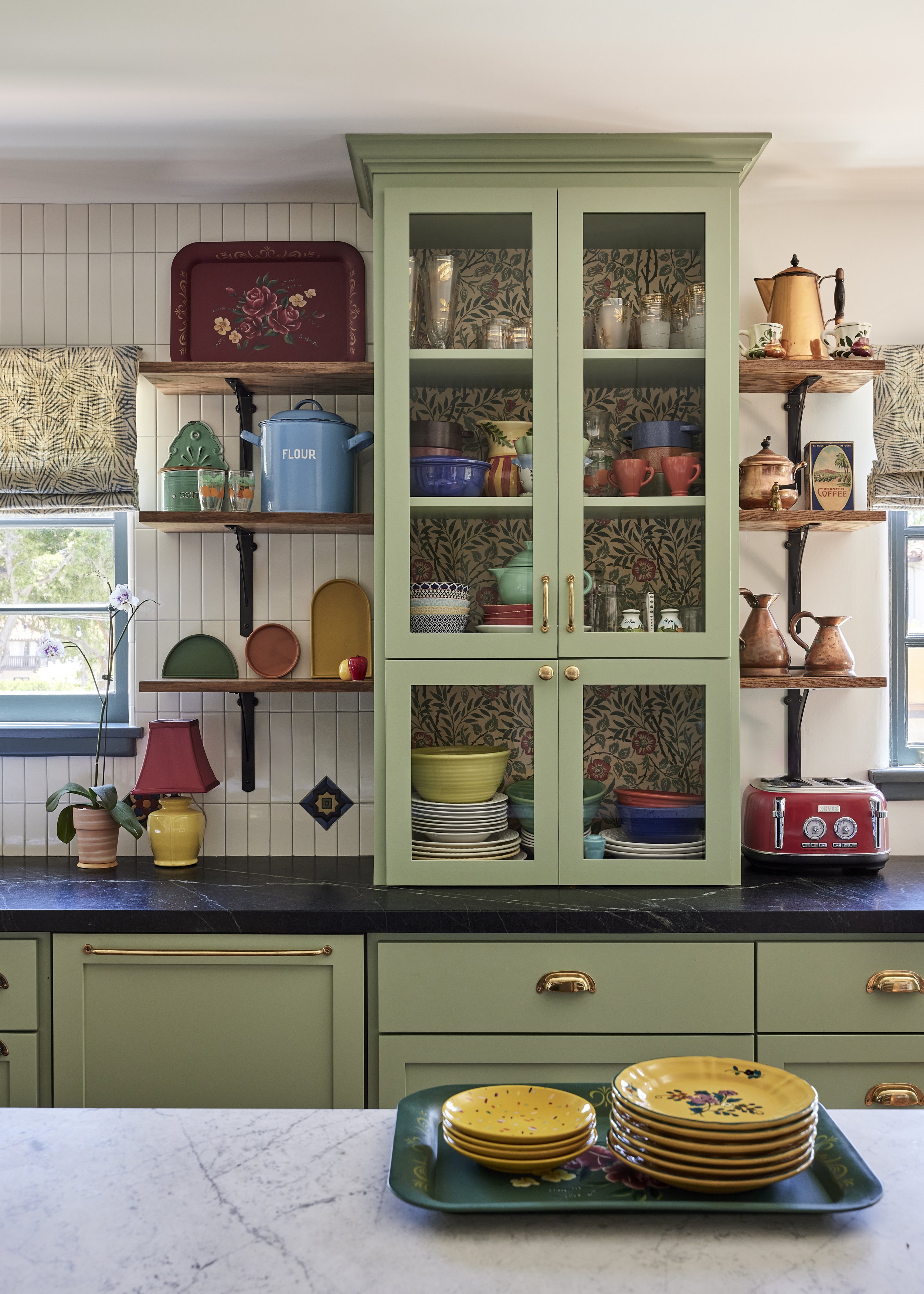 We replaced the flooring with brand new oak to match the rest of the house, and also repainted and decorated the dining room. The style speaks to the owner’s love of vintage, old California/Spanish style, bright colors and patterned tile. All new Wolf and Sub-Zero appliances shine in a space that preserves the original wood windows and doors. Custom cabinetry includes the 8’ island with French Country carved legs. Counters are soapstone and Venetino marble.
