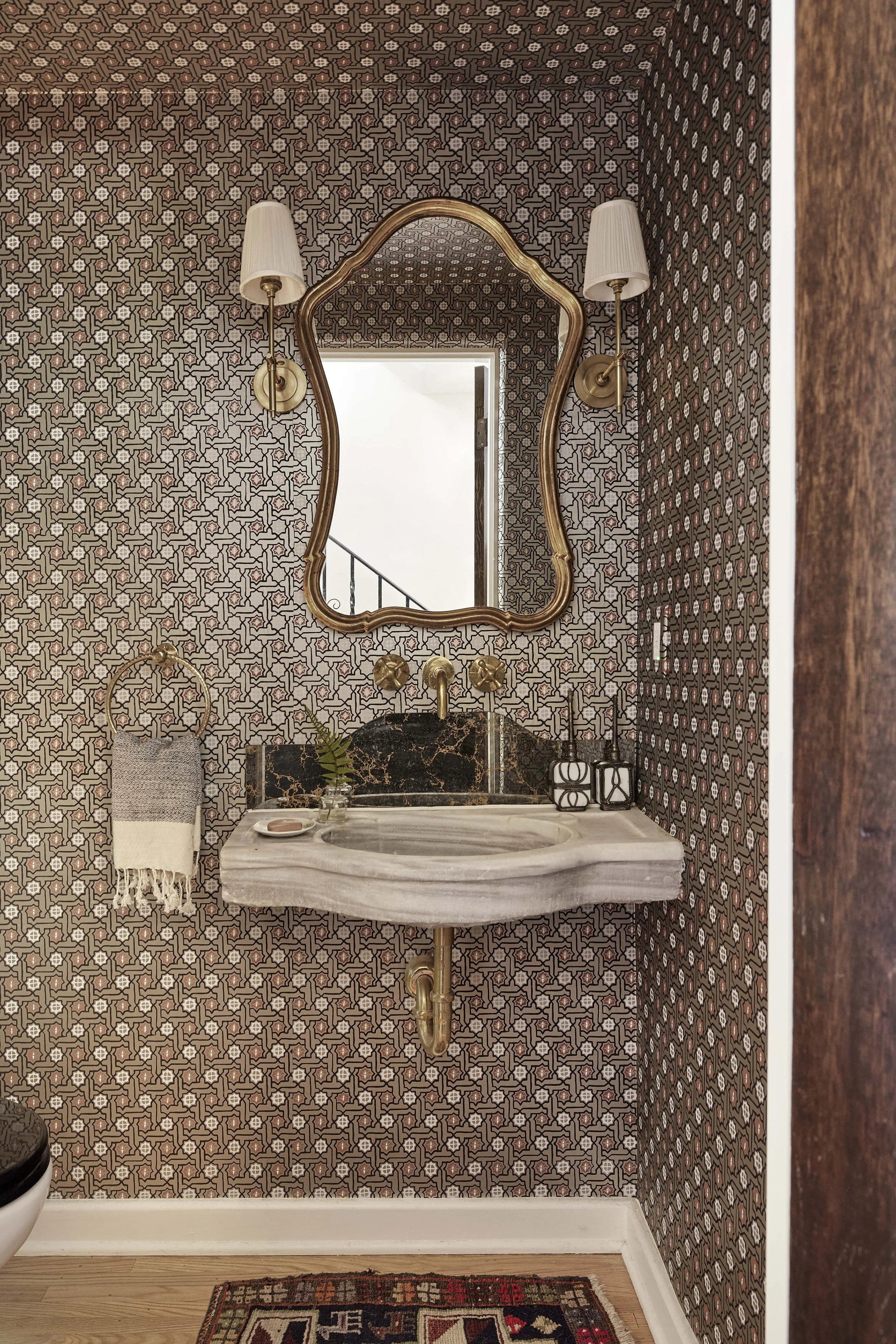 The Laundry Room was moved upstairs and the Kitchen was enlarged by the removal of two walls to create a magical large family kitchen with a large island that seats 4. The Full Bathroom was relocated with a new design, and the Powder Room created in a former Coat Closet.